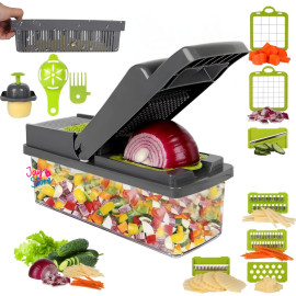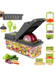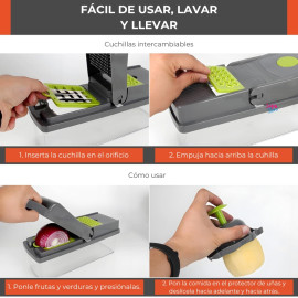 Nuestro cortador mandolina no solo ofrece una eficiente forma de cortar, picar y rallar una variedad de verduras, frutas y más, sino que también se presenta como un práctico ayudante culinario de 12 en 1. Su diseño ergonómico y duradero garantiza un manejo cómodo y una larga vida útil.