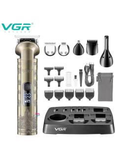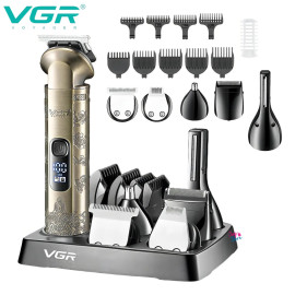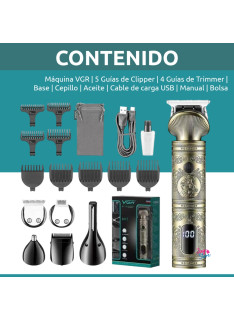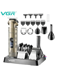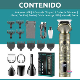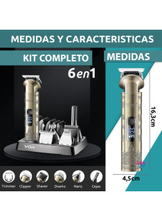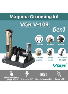 Kit Multifuncional VGR V-109: Máquina 6 en 1 con cuerpo metálico premium. Ideal para cabello, barba y precisión. Incluye base organizadora y pantalla LED. ¡Estilo profesional en casa!